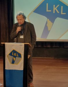 Vuoden 2024 kullankaivajatekona palkittiin kirja ”Taistelu Lemmenjoen kullasta, Kari ja Sirkka Merenluodon tarina” ja sen kirjoittaja Ilmari A. Kankaala. Palkinnon otti vastaa kirjan kustantajan roolissa Heikki Orava. Hyvä kirja syntyi totutulla tavalla kirjailijan ja kustantajan saumattomalla yhteistyöllä, johon kuului myös Sirkan ja Karin antama apu ja aineisto valokuvineen ja dokumentteineen. Kunnioitettavaa oli kirjoittajan monen vuoden perehtyminen aiheeseen ja sen muokkaaminen helposti luettavaksi ja yllättävän monipuoliseksi kirjaksi. Kirjaan on hyvin taltioitu merkittävä vaihe Lemmenjoen historiasta nyt, kun tuo aika on jäänyt taaksemme. Kuvassa Heikki Orava oikealla vierellään LKL:n hallituksen jäseniä Tapio Soukka, Esko Orava ja Antti Peronius. Kuva Raimo Niemelä.