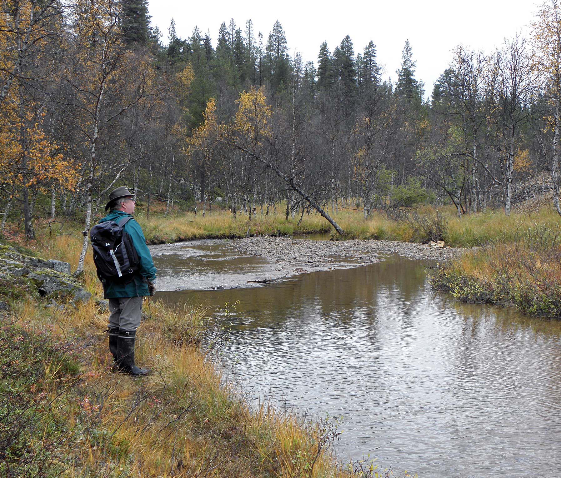 Jäähyväiset Laaniojalle ja kultakesälle 2012; Raimo Niemelä katselee haikeana ruskaan pukeutunutta puromaisemaa, jossa moni kultahippu vielä odottaa löytäjäänsä.
