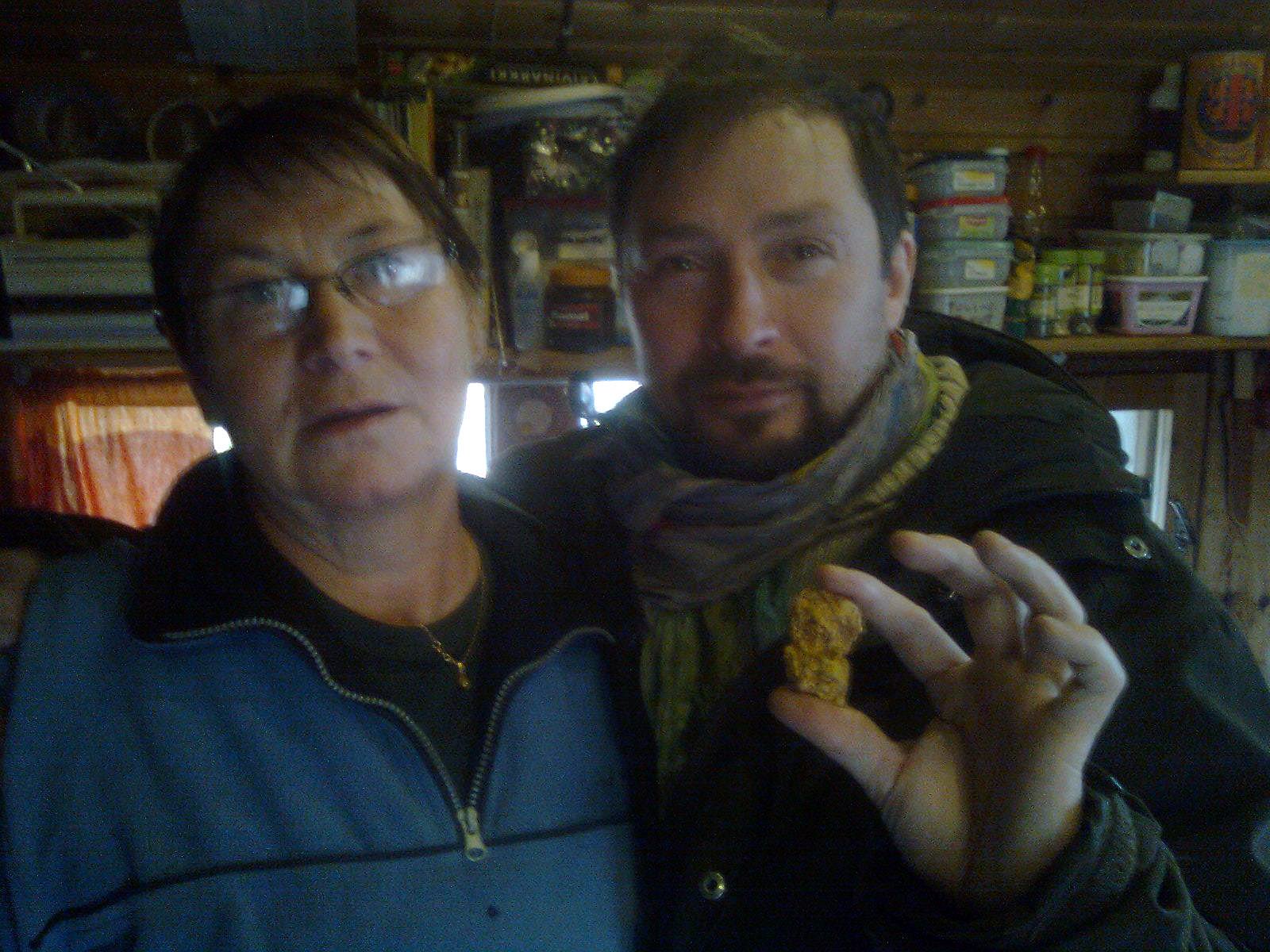 Sirkka Merenluoto ja 127,1 g hippu, jota pitää kädessään Jukka Kela. Kuva on otettu syys- ja lokakuun vaihteessa Merenluotojen kämpässä ja se on poimittu Jukka Kelan Facebook-sivulta, onnittelukäynniltä.