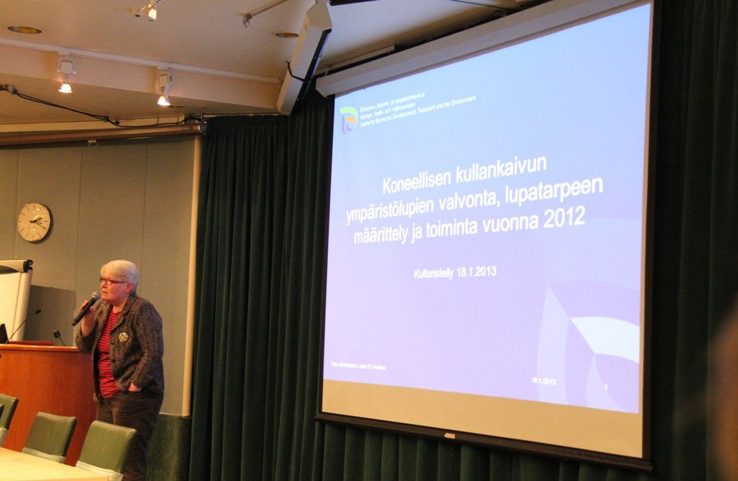 Tiina Kämäräinen ympäristösuojeluyksikön esimies Lapin ELY-keskuksesta kertoi, että koneellisen kullankaivun määritelmä pitää sisällään niin isot kuin pienet koneet sekä imurikaivun. Näihin pitää hakea ympäristölupa. Jotkin pienet toimenpiteet eivät vaadi ympäristölupaa, esimerkiksi tutkimuskuopan kaivamiseen ELY-keskus voi antaa lausunnon, jossa määritellään mitä, missä ja milloin saa tehdä. Irtomaan nosto kaivinkoneella ränniin on kuitenkin koneellista kullankaivua. Koneellisen kullankaivun määritelmää tulisi tarkentaa.