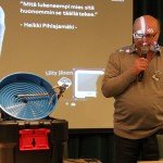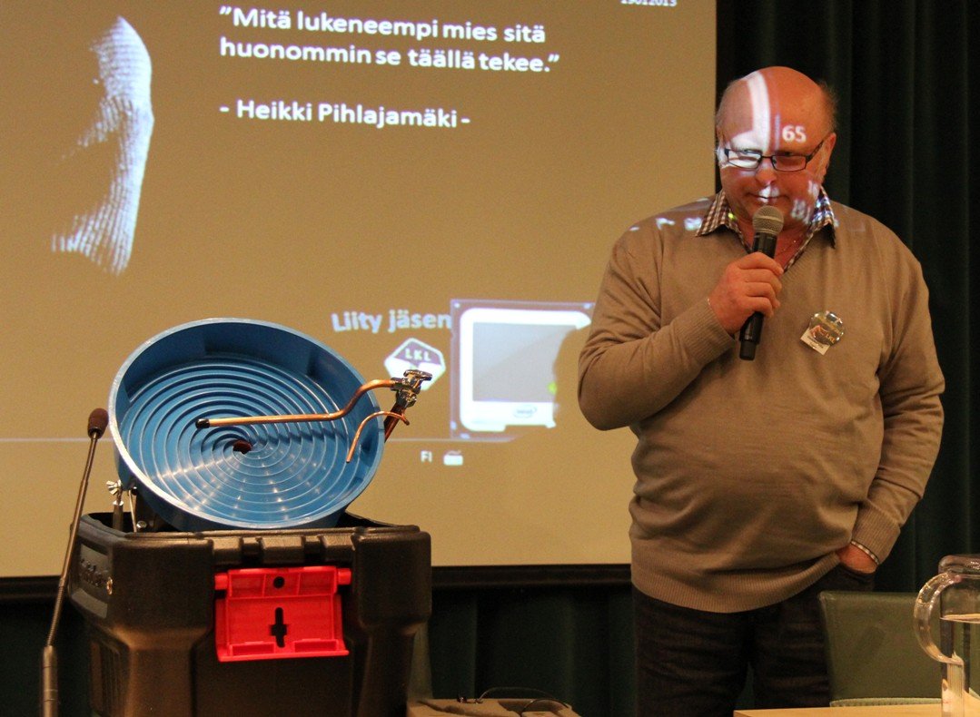 Tapio Hummelholm esitteli pienikokoista spiraalilautaserottimen matkamallia. Erotin soveltuu tutkimuksiin ja upan loppuerotteluun.