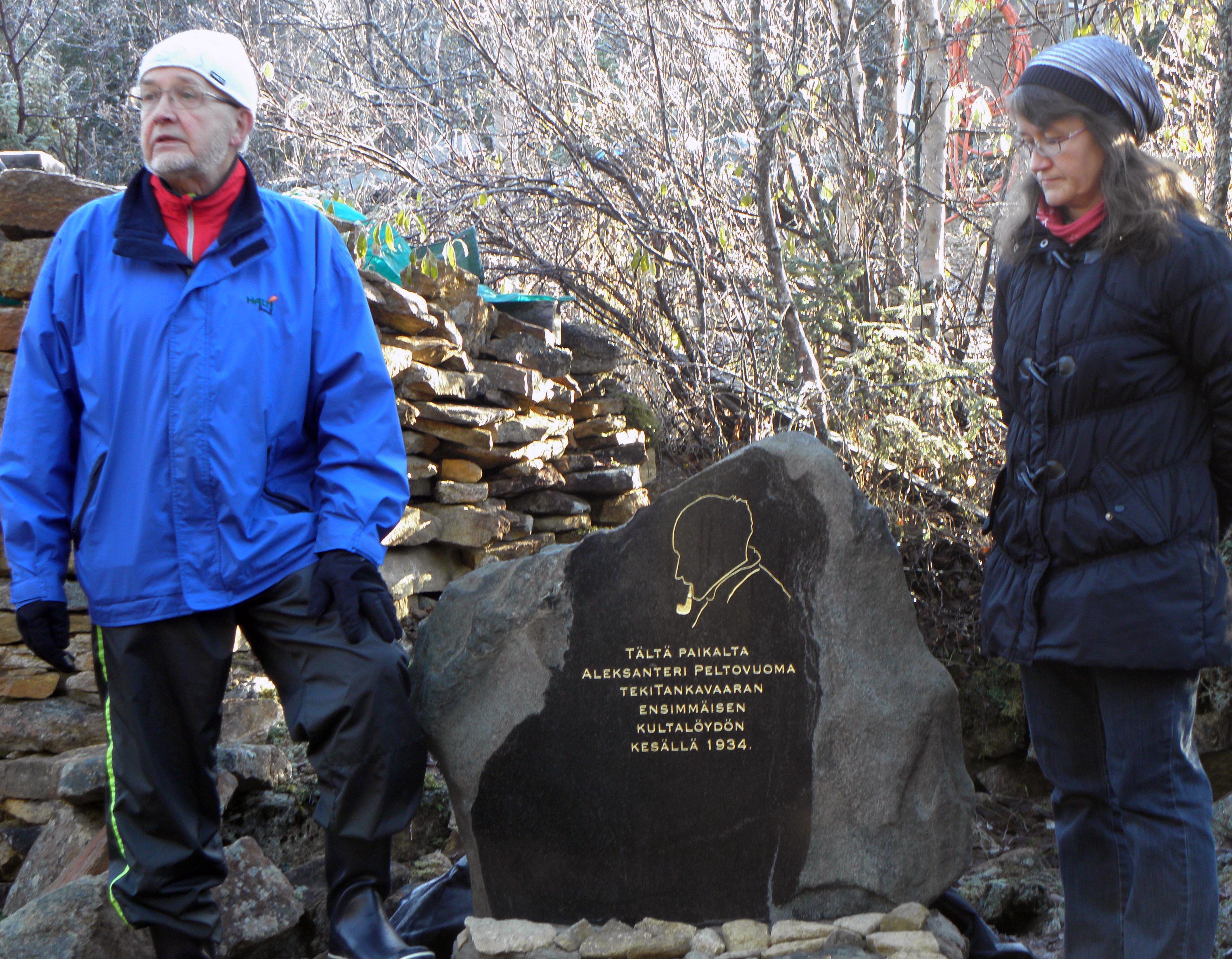 Museojohtaja Heli Heinäaho ja tietokirjailija Seppo J. Partanen paljastavat patsaan Tankavaaran kullan löytöpaikalla. Taustalla näkyy tämän päivän kullankaivuvälineistöä.