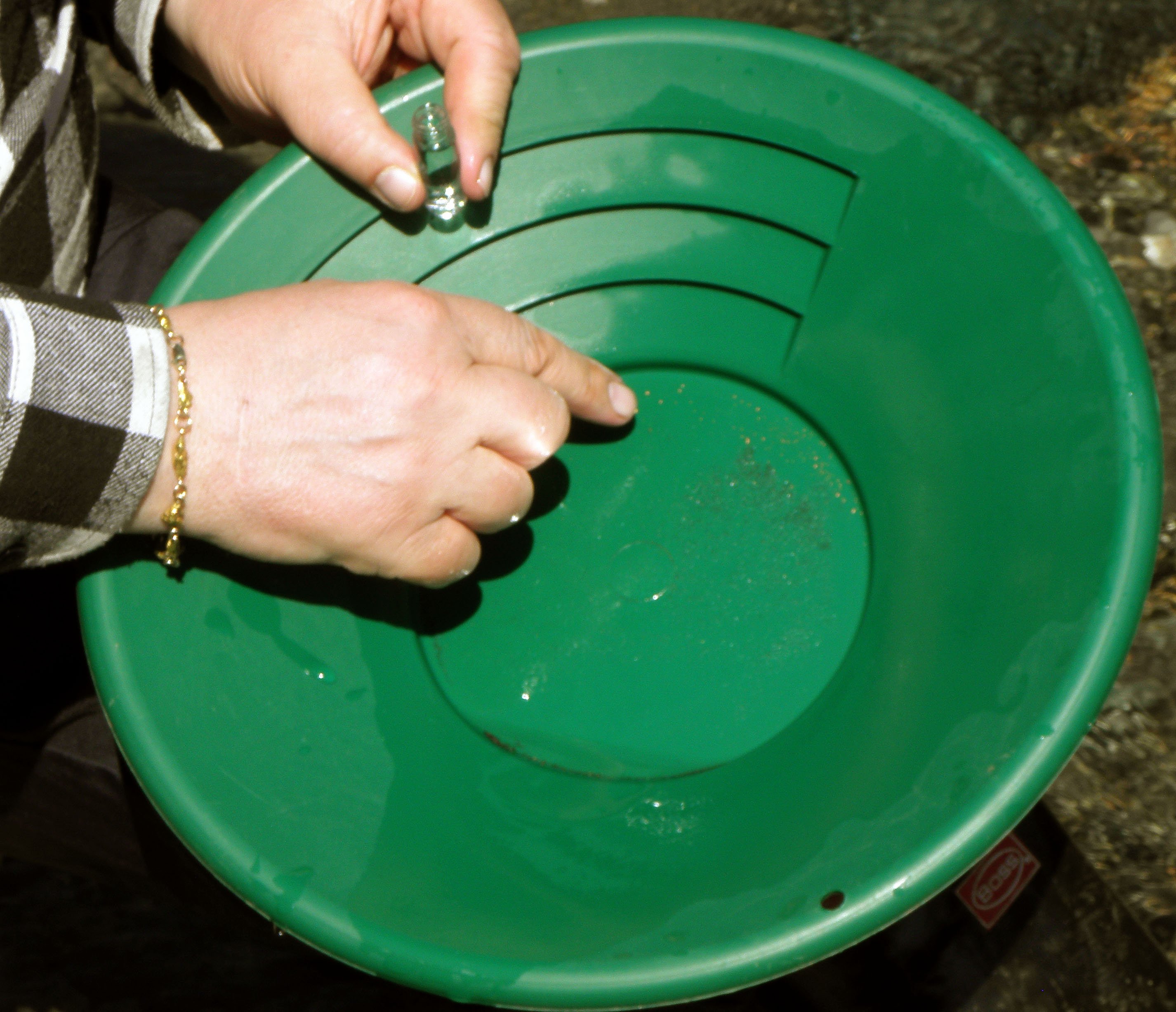Tästä hetkestä haaveilee moni aloitteleva kullankaivaja; kultaa vaskoolissa. Nämä kourat ovat pitäneet vaskoolia ennekin, katsopa oikean käden hippukorua!