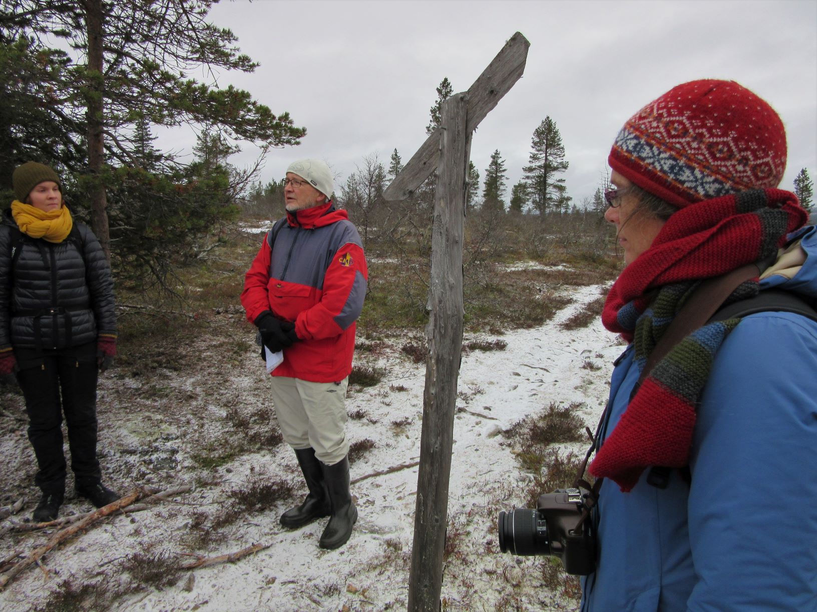 Vanhojen kulkukeinojen jälkiä löytyy kaikkialta ja ne kertovat kulkemisesta ennen maanteitä. Reitit merkittiin veistämällä puuhun pilkka, kivikasoilla avotunturissa tai kuvan kaltaisilla puuviitoilla. Kuvassa oikealta Hanna Mattila Kultamuseossa, Seppo J. Partanen ja Siiri Tolonen MH:n Luontopalvelusta