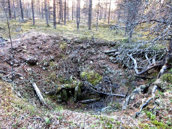 Ivalojoen ja Laanilan alueella on toistakymmentä kultakaivosta 1900-luvun alusta. Lisäksi maasto on runsaasti vanhoja koekaivantoja, kuten tämä Laanilan Tullipalon kaivanto. Se lienee Prospektor Oy tekemä.