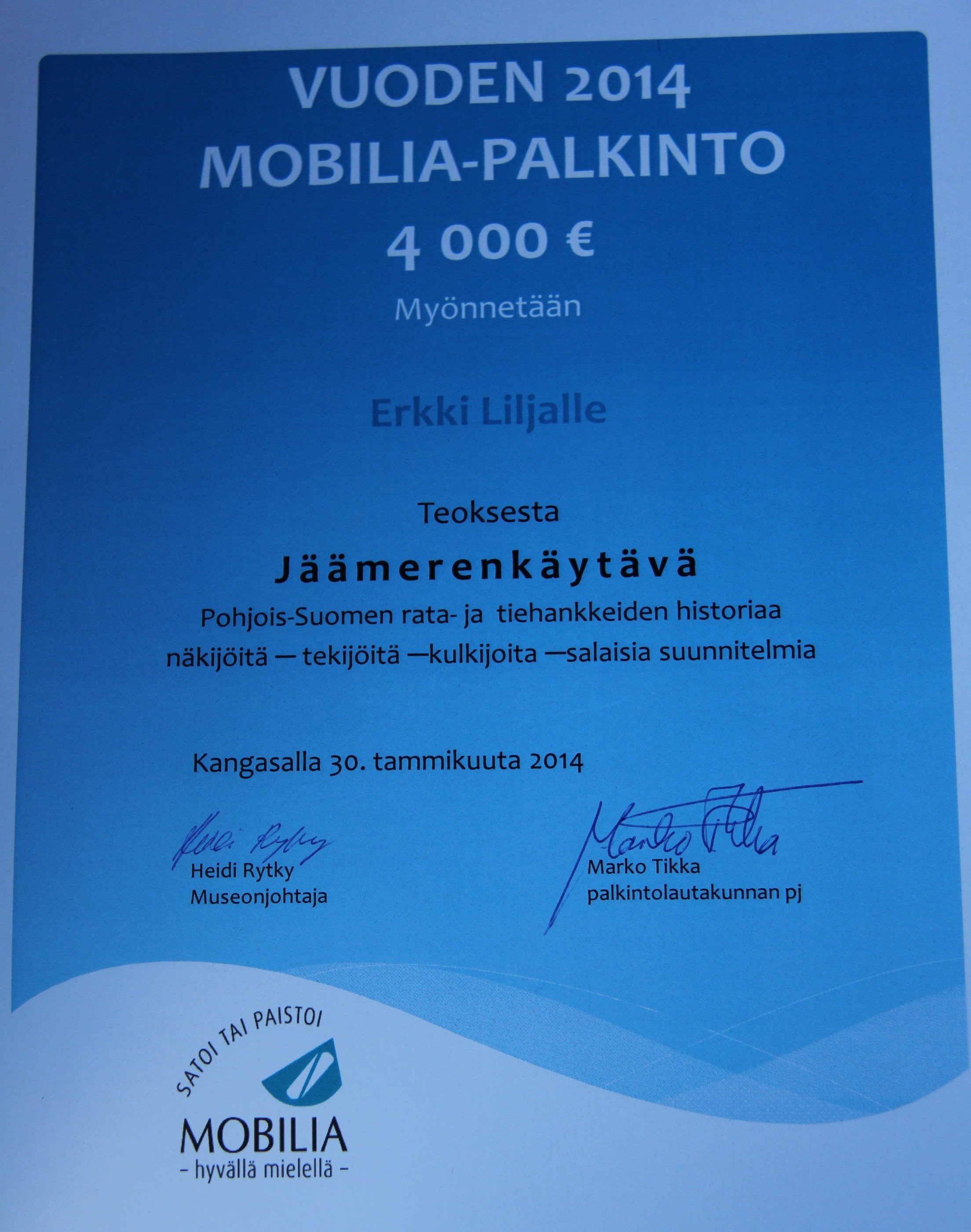Vuoden 2014 Mobilia-palkinto myönnettiin kirjailija Erkki Liljalle teoksesta JÄÄMERENKÄYTÄVÄ, Pohjois-Suomen rata- ja tiehankkeiden historiaa, näkijöitä – tekijöitä – kulkijoita – salaisia suunnitelmia.