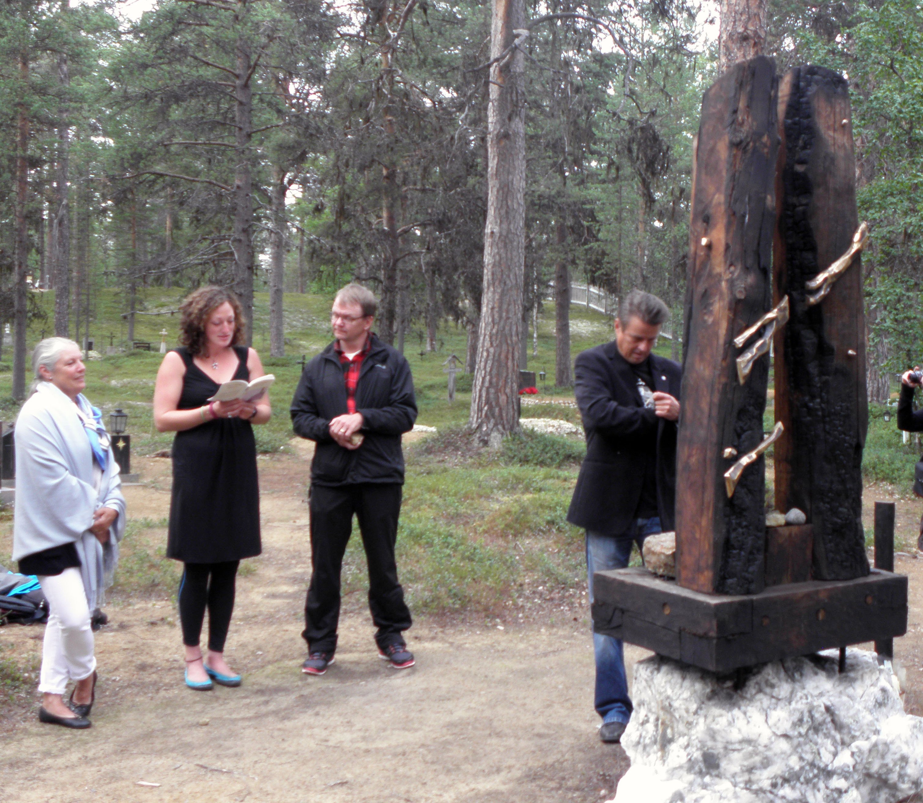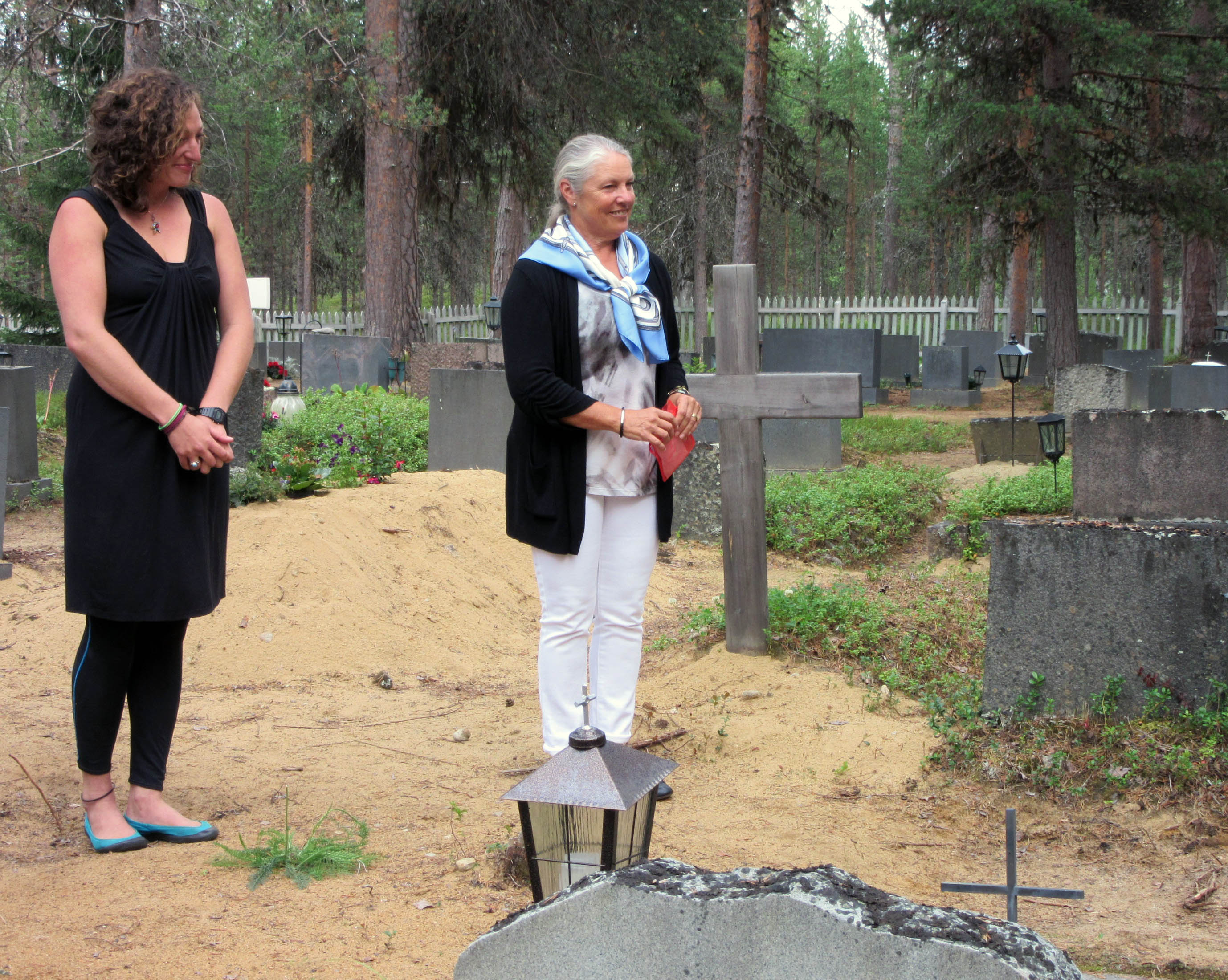 Solega, Jenny, Jouko Korhonen ja Kai Rantanen kiinnittävät Petronellan muistolaattaa Inarin hautasumaalla Tuhkapyrkyrien muistopaadelle. Alla laatan teksti kameramiehen heijastuksella koristeltuna.