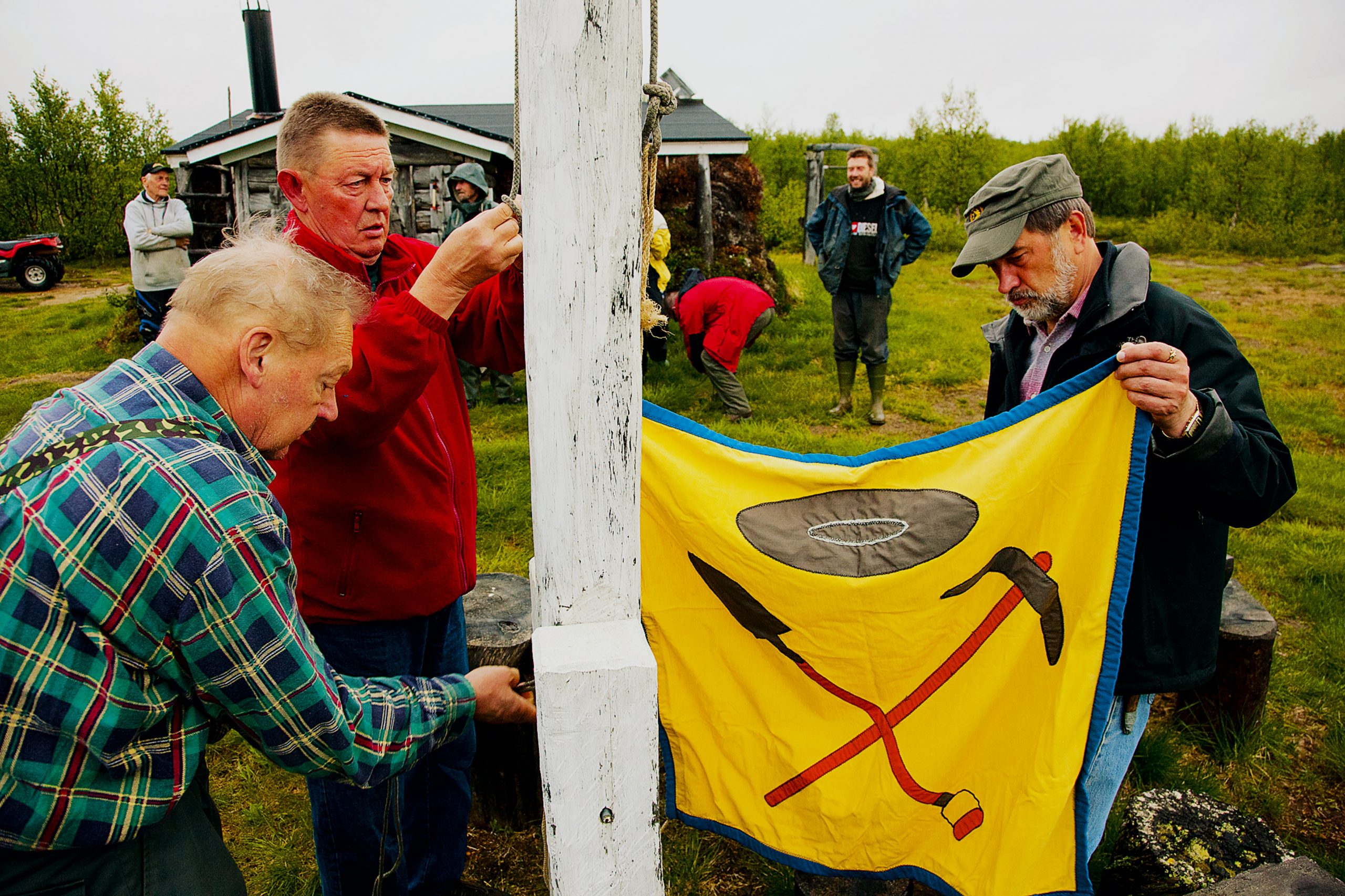 Lemmenjoella taisteltiin kullan kaivuoikeuksista vuosituhannen vaihteen molemmin puolin. Monta taistelua voitettiin, kunnes koko sota hävittiin. Tässä taistelulikkua nostetaan salkoon Ilkka Ärrälän kuvassa Miessin Pihlajamäessä. Lippua nostamssa oikealta Pekka Salonen, Pekka Itkonen ja Toivo Rapeli.
