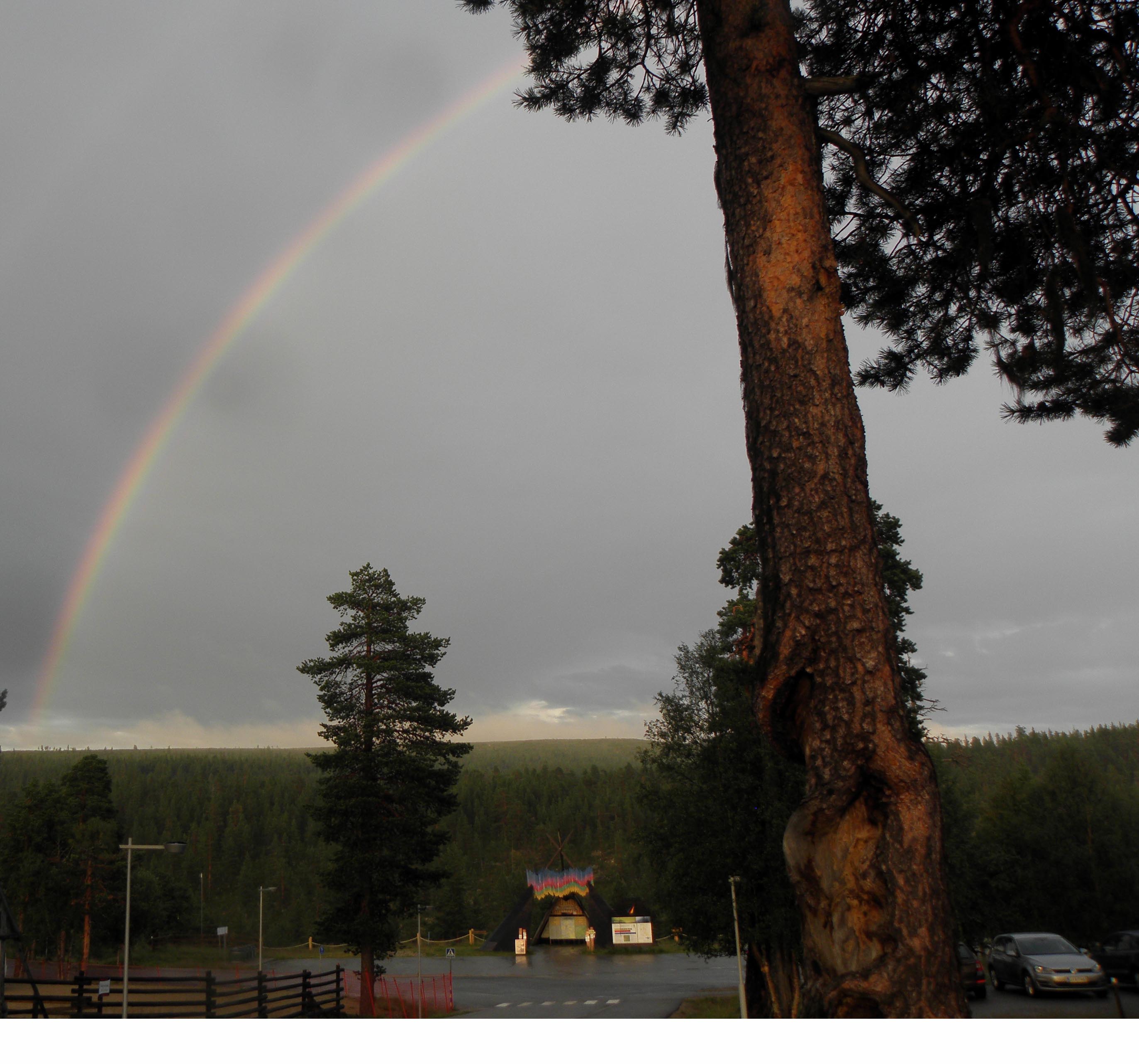 Sateenkaari Saariselän lomakaupungin yllä syksyllä 2014 päätyy Luttojoen uomaan, josta yli vuosisadan on kaivettu ja löydetty kultaa. Oikealla portti kansallispuistooon johtaville poluille.