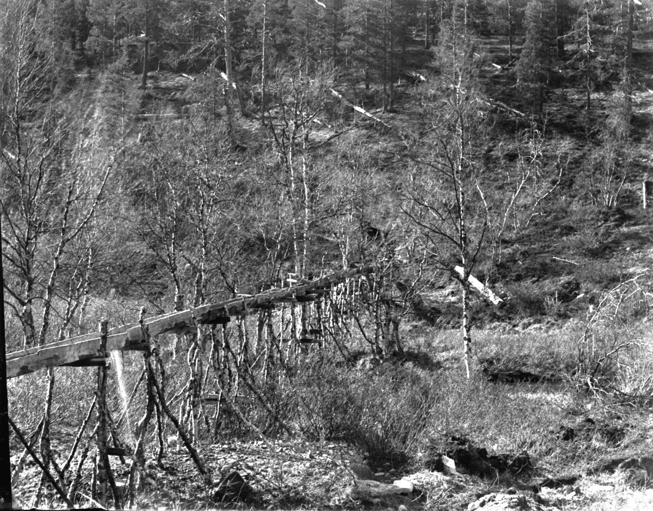 Näin vettä kuljetettiin huuhtopaikalle 1920-luvulla jopa kilometrien pituisilla puuränneillä. Tämä kuva on Hangasojan alueelta Ivalojoki Oy:n työmaalta, GTK:n arkisto.