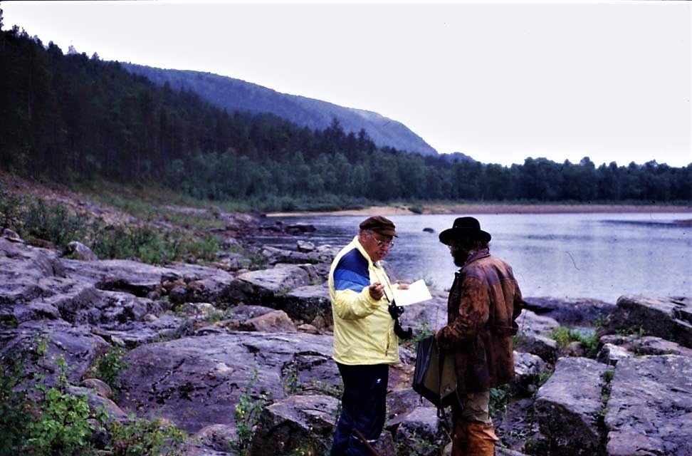 Herman Stigzelius ja Kauko Launonen tutkivat Nulkkamukassa Lihrin kultalöydön paikkaa 1986. Taustalla Palsitunturi.